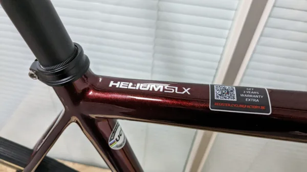 The Helium SLX Disc is the top of our ultra-gourmet Helium line of bikes. It’s extremely lightweight. The frame tips the scale at 780gr for a size small, which is only 50g heavier than the rim brake model.